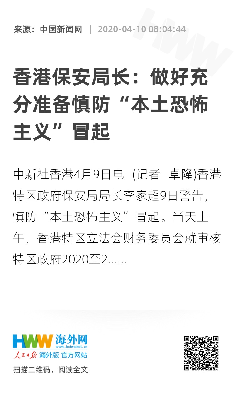 中新社香港4月9日电 (记者 卓隆)香港特区政府保安局局长李家超9日警告,慎防“本土恐怖主义”冒起。