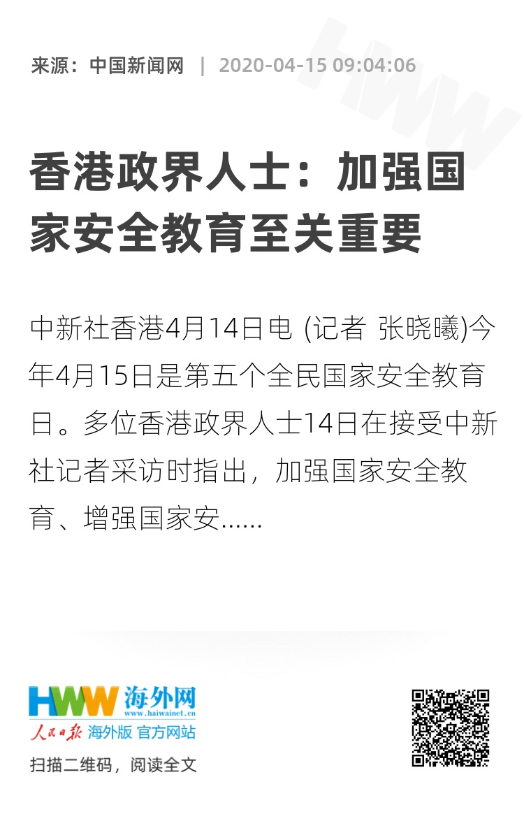 中新社香港4月14日电 (记者 张晓曦)今年4月15日是第五个全民国家安全教育日。多位香港政界人士14日在接受中新社记者采访时指出,加强国家安全教育、增强国家安全意识对香港来说至关重要,希望相关概念可以继续得到较好的推广。