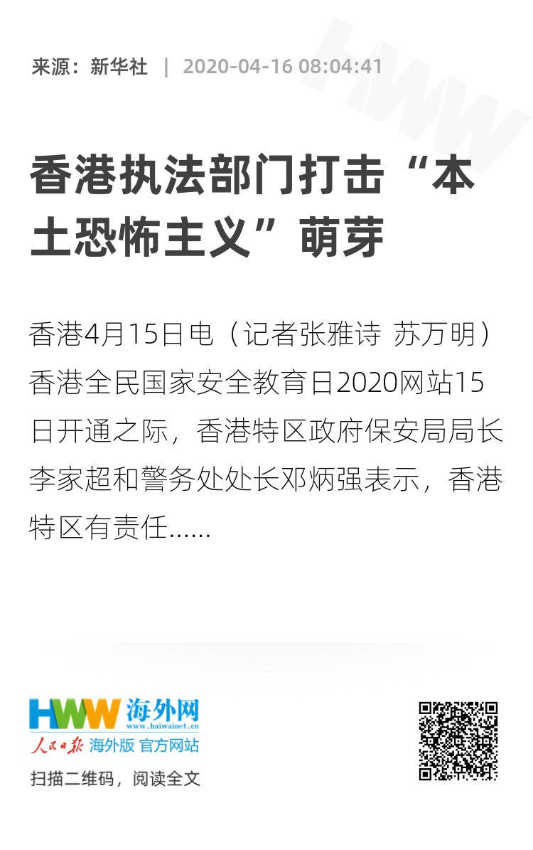 新华社香港4月15日电(记者张雅诗 苏万明)香港全民国家安全教育日2020网站15日开通之际,香港特区政府保安局局长李家超和警务处处长邓炳强表示,香港特区有责任、香港同胞有义务维护国家安全。他们呼吁香港市民为国家安全出力,支持特区政府共同守护香港。