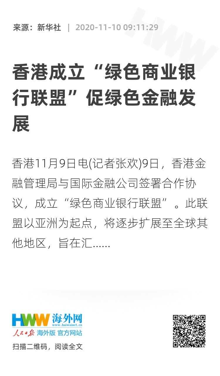新华社香港11月9日电(记者张欢)9日,香港金融管理局与国际金融公司签署合作协议,成立“绿色商业银行联盟”。此联盟以亚洲为起点,将逐步扩展至全球其他地区,旨在汇聚银行、其他金融机构、研究机构、技术创新企业的力量,协助银行业界应对气候变化及推进绿色金融业务。