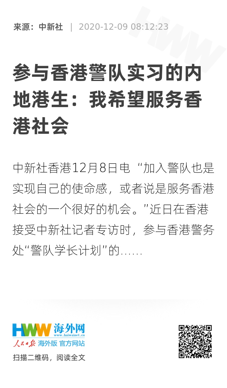 中新社香港12月8日电 “加入警队也是实现自己的使命感,或者说是服务香港社会的一个很好的机会。”近日在香港接受中新社记者专访时,参与香港警务处“警队学长计划”的刘同学淡定的语气中透着一丝兴奋。