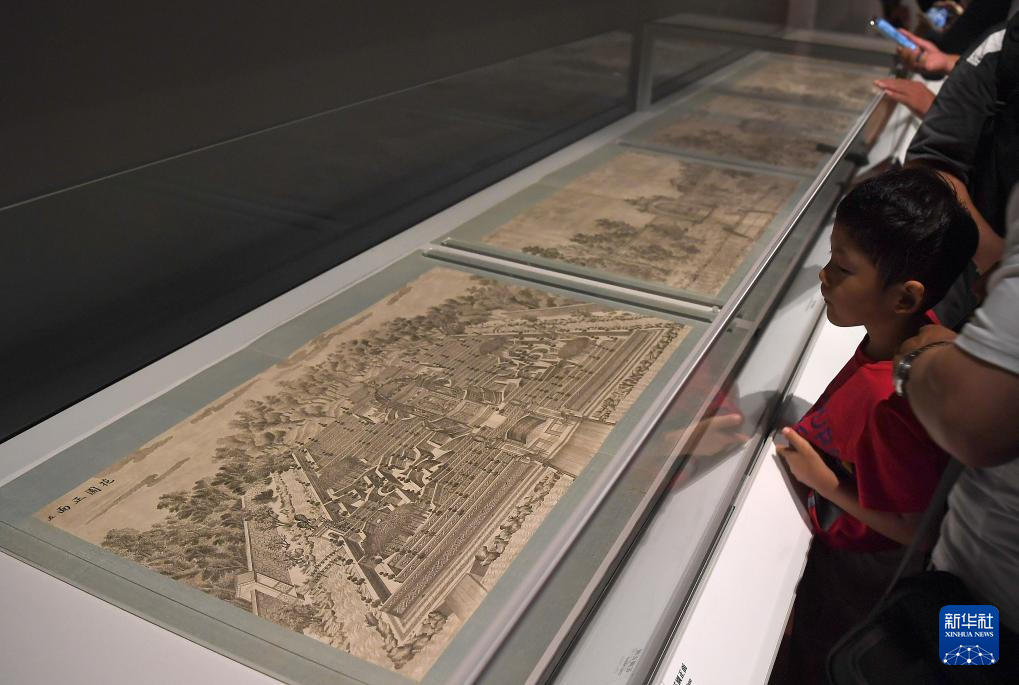2023年7月3日,一名小朋友在香港故宫文化博物馆观看《圆明园西洋楼二十景图》。新华社记者 陈铎 摄