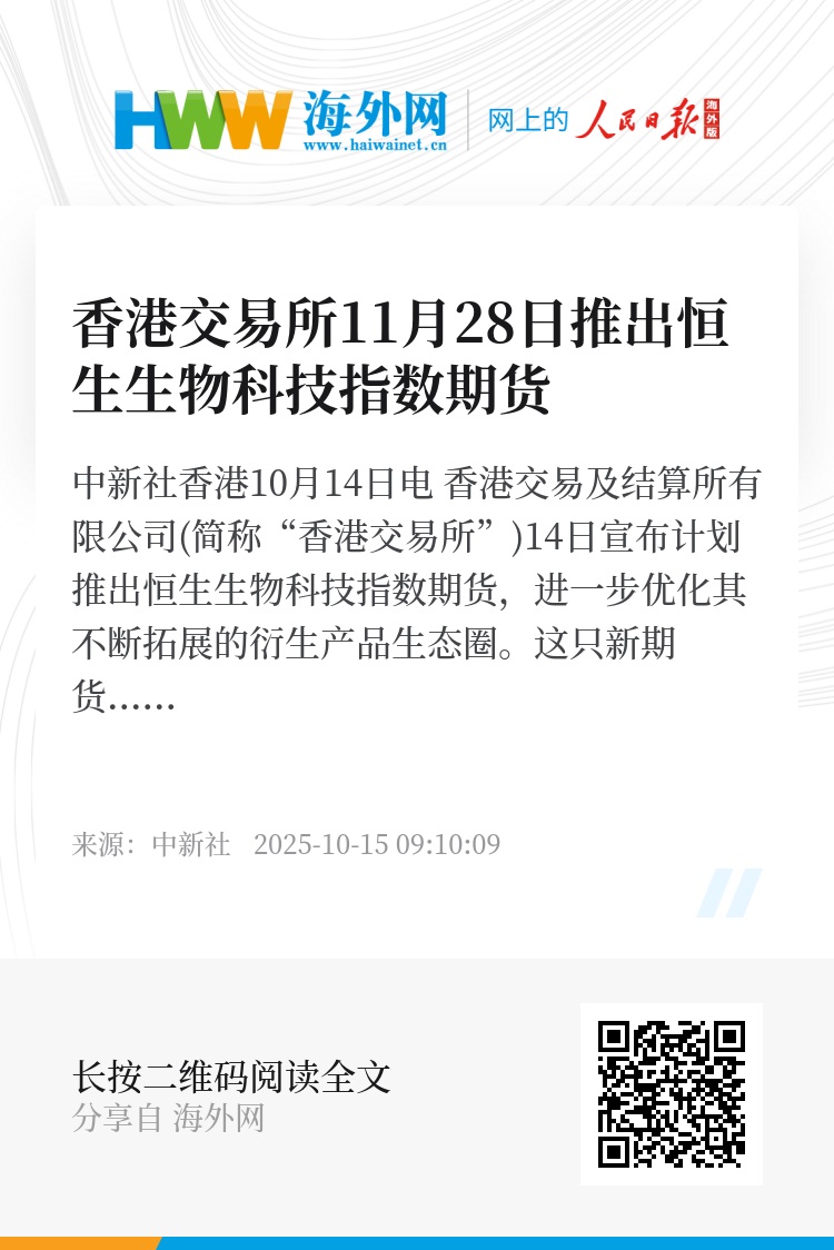 中新社香港10月14日电 香港交易及结算所有限公司(简称“香港交易所”)14日宣布计划推出恒生生物科技指数期货,进一步优化其不断拓展的衍生产品生态圈。