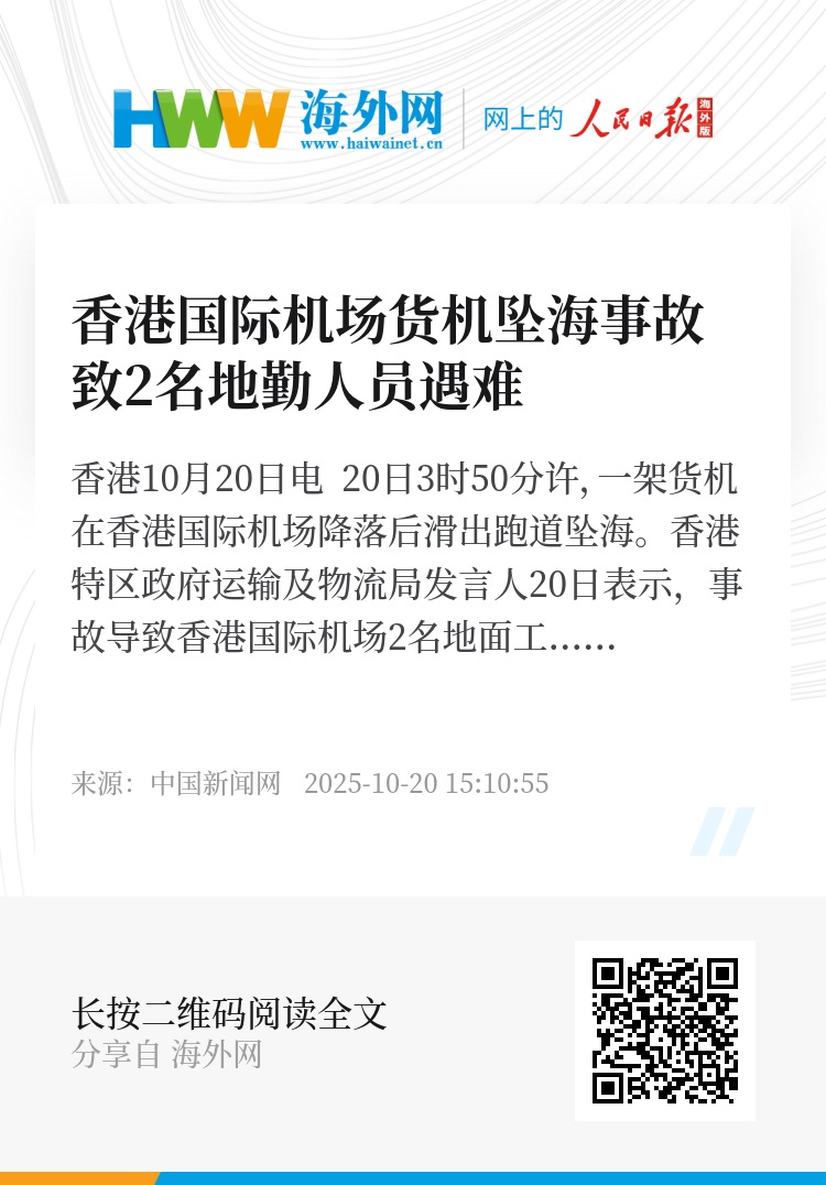 中新网香港10月20日电 20日3时50分许,一架货机在香港国际机场降落后滑出跑道坠海。香港特区政府运输及物流局发言人20日表示,事故导致香港国际机场2名地面工作人员不幸遇难,4名机组人员已获救送医。