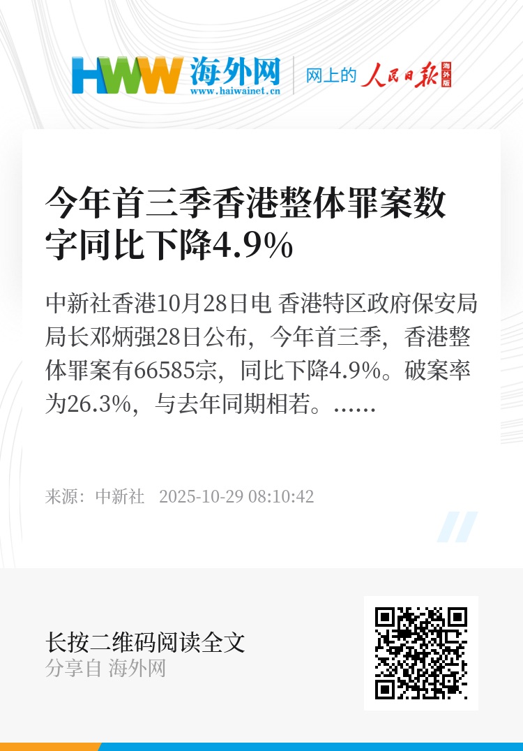 中新社香港10月28日电 香港特区政府保安局局长邓炳强28日公布,今年首三季,香港整体罪案有66585宗,同比下降4.9%。破案率为26.3%,与去年同期相若。