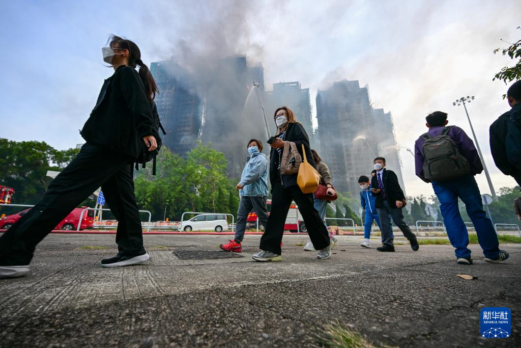 11月27日,行人从香港大埔屋邨宏福苑火灾现场附近走过。11月27日凌晨,香港警方和消防部门召开记者会宣布,大埔屋邨宏福苑火灾目前已造成44人遇难,45人受伤。警方已拘捕3名涉嫌误杀的男子。新华社记者 朱炜 摄