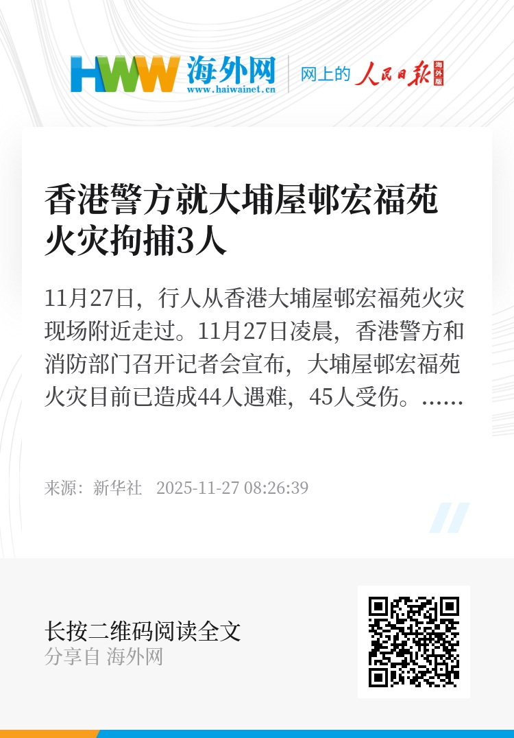 新华社香港11月27日电(记者曹霁阳、孟佳)香港警方和消防部门27日凌晨召开记者会宣布,大埔屋邨宏福苑火灾目前已造成44人遇难,45人受伤。警方已拘捕3名涉嫌误杀的男子。