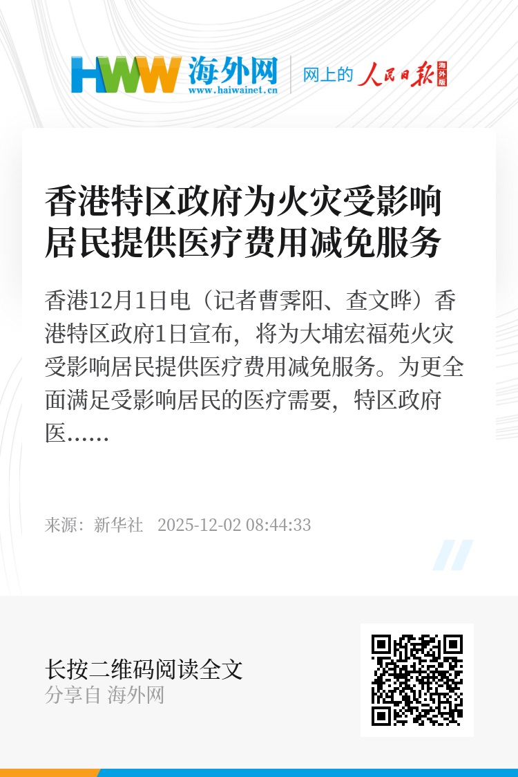 新华社香港12月1日电(记者曹霁阳、查文晔)香港特区政府1日宣布,将为大埔宏福苑火灾受影响居民提供医疗费用减免服务。