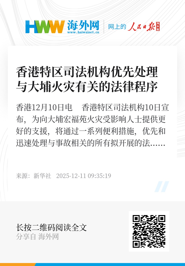 新华社香港12月10日电 香港特区司法机构10日宣布,为向大埔宏福苑火灾受影响人士提供更好的支援,将通过一系列便利措施,优先和迅速处理与事故相关的所有拟开展的法律程序。
