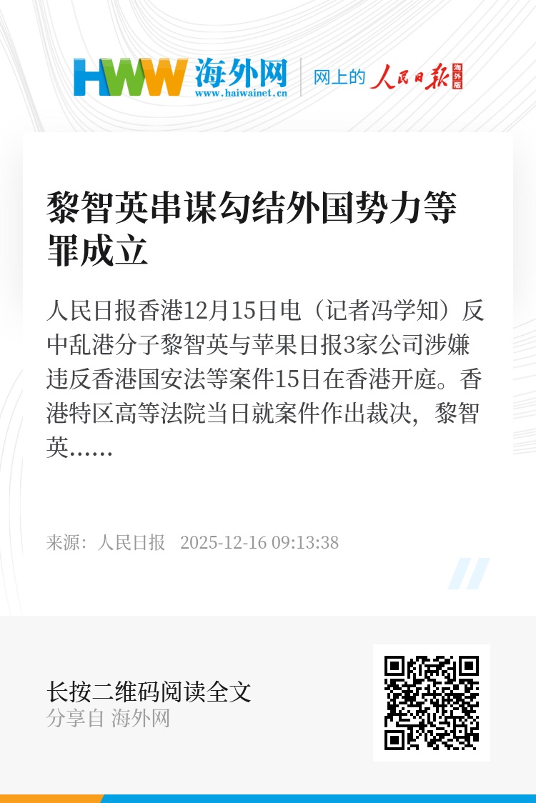 人民日报香港12月15日电(记者冯学知)反中乱港分子黎智英与苹果日报3家公司涉嫌违反香港国安法等案件15日在香港开庭。香港特区高等法院当日就案件作出裁决,黎智英两项串谋勾结外国势力罪及一项串谋发布煽动刊物罪成立。