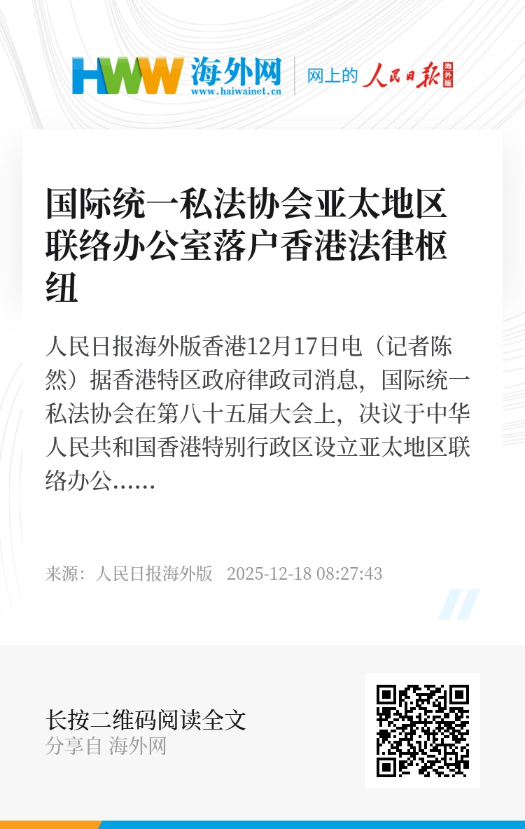 人民日报海外版香港12月17日电(记者陈然)据香港特区政府律政司消息,国际统一私法协会在第八十五届大会上,决议于中华人民共和国香港特别行政区设立亚太地区联络办公室。该办公室预计将于2026年下半年进驻香港法律枢纽,作为国际统一私法协会百年庆典活动之一。