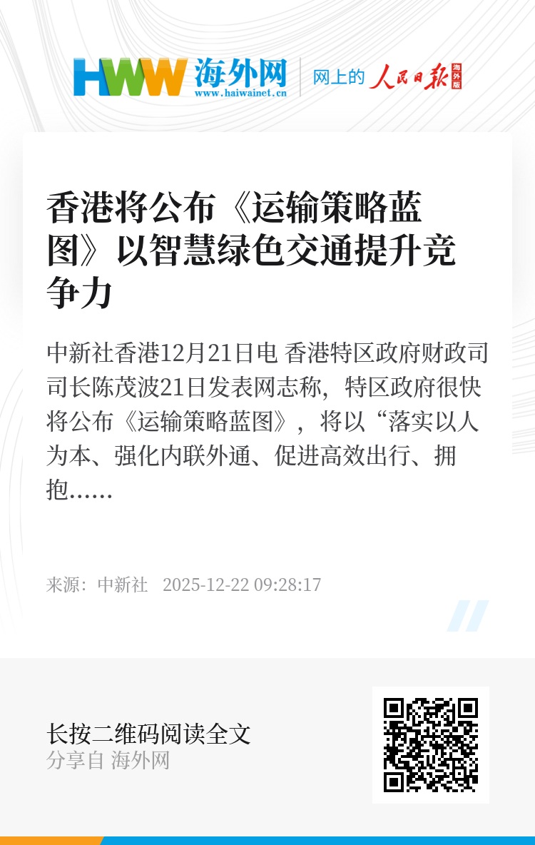 中新社香港12月21日电 香港特区政府财政司司长陈茂波21日发表网志称,特区政府很快将公布《运输策略蓝图》,将以“落实以人为本、强化内联外通、促进高效出行、拥抱绿色生活”为愿景,让香港的交通网络与城市管理更智能化发展,不断提升市民的生活质素和交通出行的便捷体验,提升香港的城市竞争力。