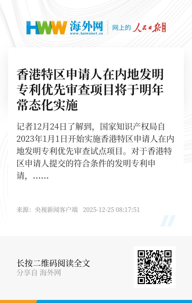 国家知识产权局介绍,将从2026年1月1日起,常态化实施香港特区申请人在内地发明专利优先审查项目,以更好地支持香港特区居民更加便捷、高效地在内地保护知识产权,推动香港特区创新发展。(总台央视记者 王婧)
