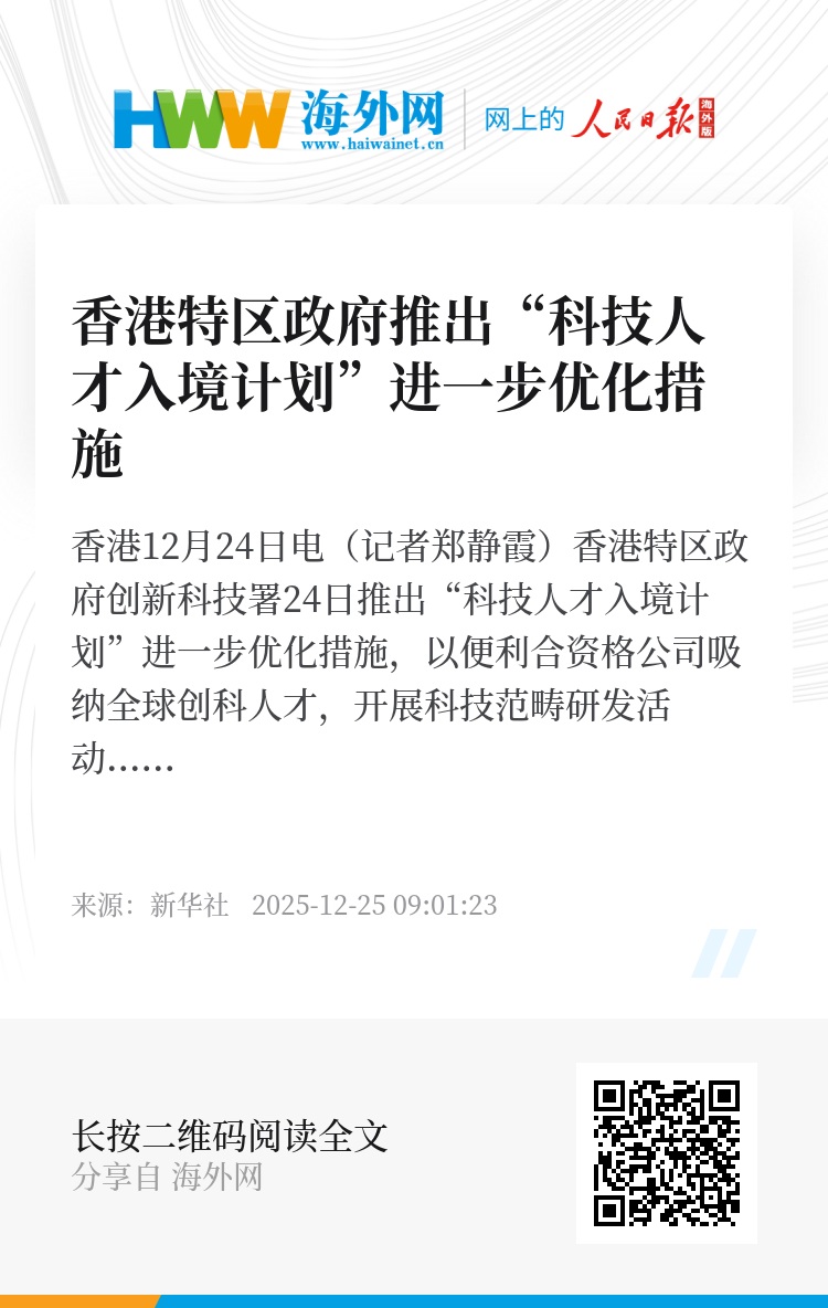 新华社香港12月24日电(记者郑静霞)香港特区政府创新科技署24日推出“科技人才入境计划”进一步优化措施,以便利合资格公司吸纳全球创科人才,开展科技范畴研发活动,促进香港创新和科技发展。
