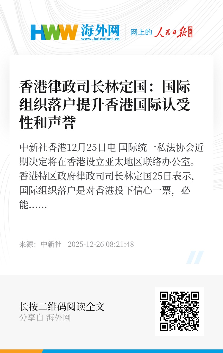 中新社香港12月25日电 国际统一私法协会近期决定将在香港设立亚太地区联络办公室。香港特区政府律政司司长林定国25日表示,国际组织落户是对香港投下信心一票,必能提升香港在国际间的认受性和声誉,巩固香港作为国际法律服务中心的地位。