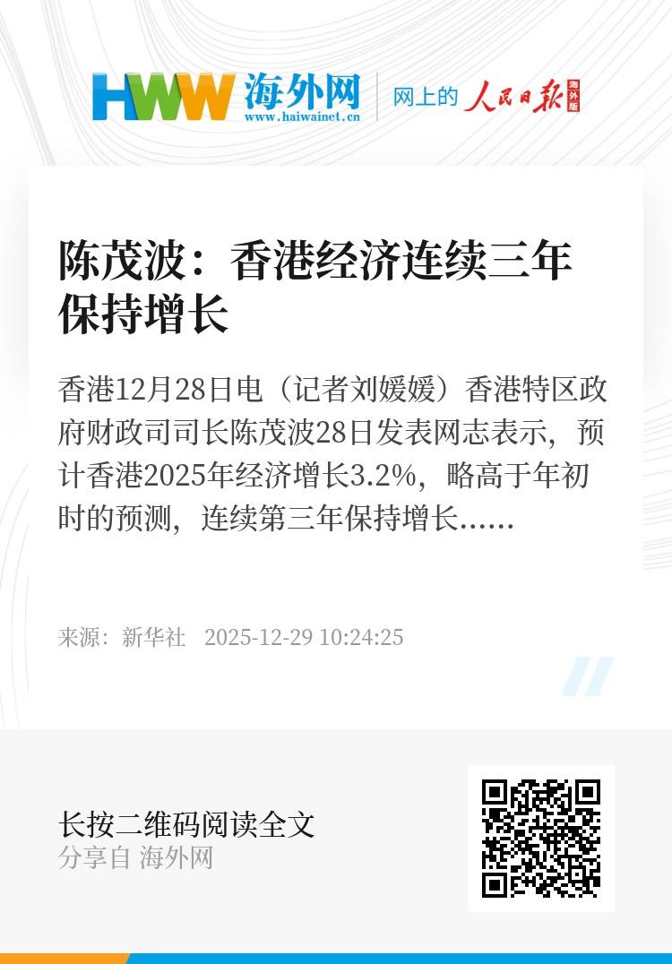 新华社香港12月28日电(记者刘媛媛)香港特区政府财政司司长陈茂波28日发表网志表示,预计香港2025年经济增长3.2%,略高于年初时的预测,连续第三年保持增长势头。