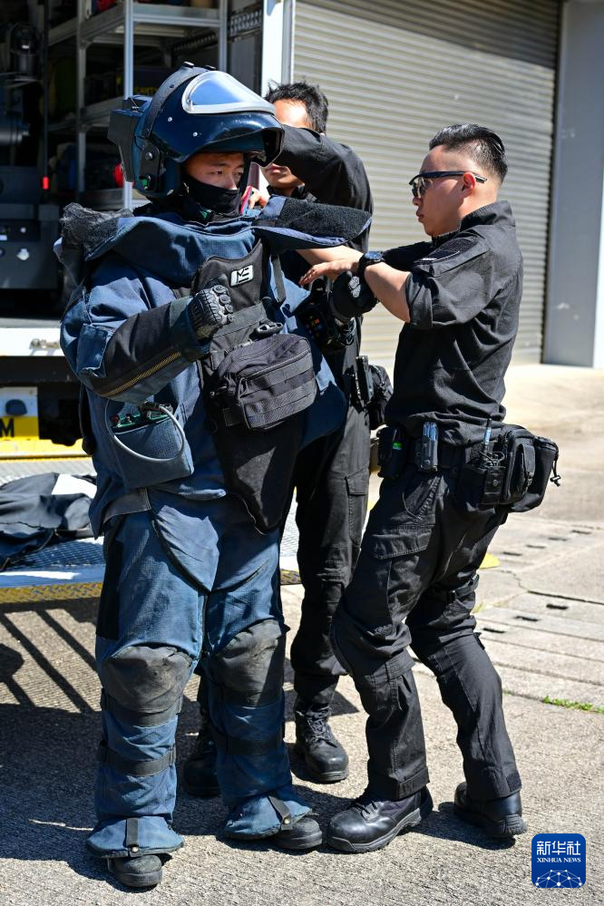 香港警务处爆炸品处理课队员协助同事穿防爆服(2025年11月6日摄)。新华社记者 朱炜 摄