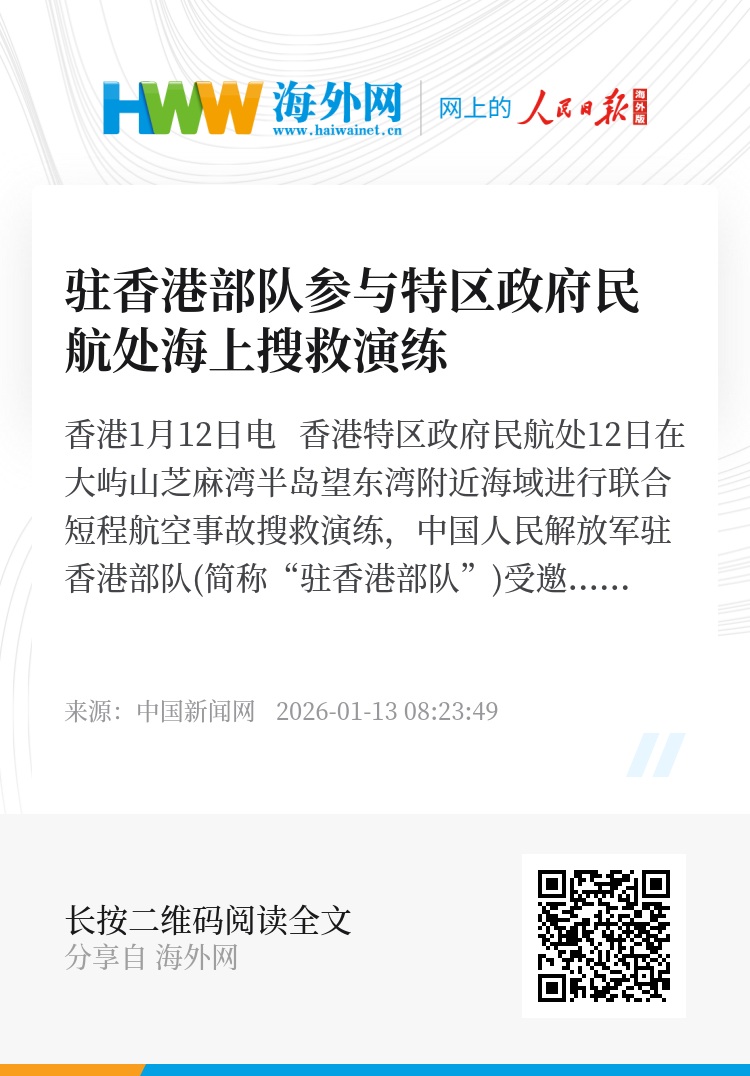 中新网香港1月12日电 香港特区政府民航处12日在大屿山芝麻湾半岛望东湾附近海域进行联合短程航空事故搜救演练,中国人民解放军驻香港部队(简称“驻香港部队”)受邀参加演练。