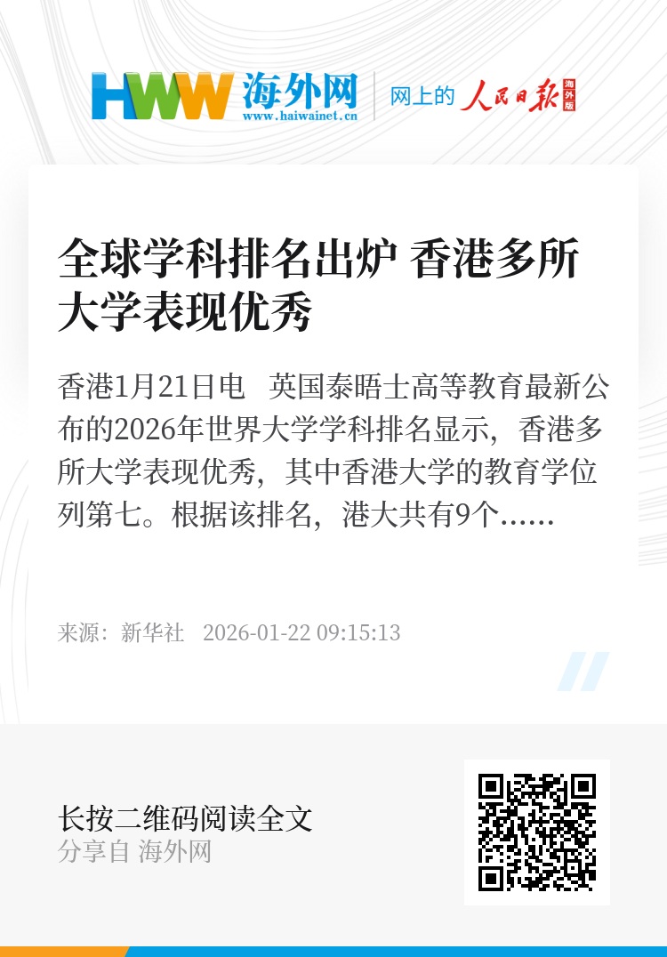 新华社香港1月21日电 英国泰晤士高等教育最新公布的2026年世界大学学科排名显示,香港多所大学表现优秀,其中香港大学的教育学位列第七。