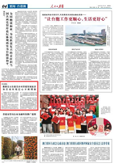 林剑在当日例行记者会上答问时说,报告显示,86%的受访企业认为香港作为国际商业中心具有竞争力,92%的受访企业无意将总部迁出香港,94%的受访企业对香港法治有信心。这些数据显示了美国在港企业对香港发展前景和营商环境的信心不断增强。