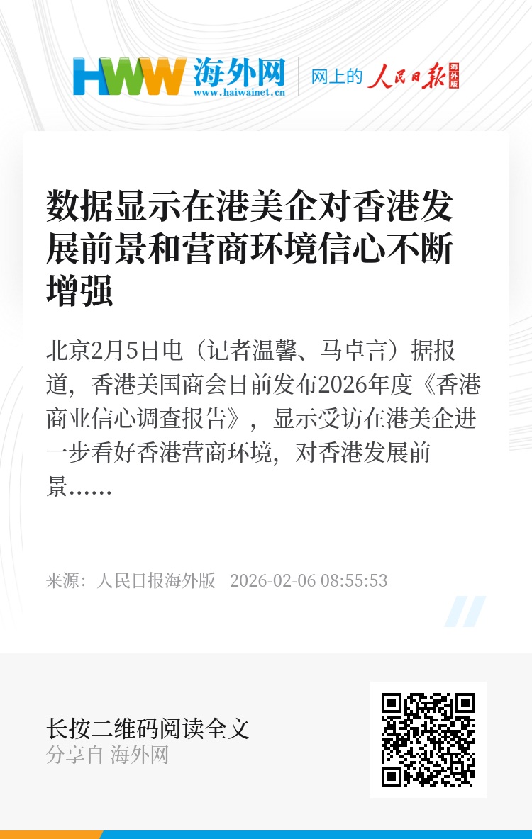新华社北京2月5日电(记者温馨、马卓言)据报道,香港美国商会日前发布2026年度《香港商业信心调查报告》,显示受访在港美企进一步看好香港营商环境,对香港发展前景充满信心。外交部发言人林剑5日对此表示,这些数据显示了美国在港企业对香港发展前景和营商环境的信心不断增强。