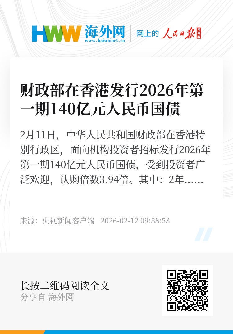 2月11日,中华人民共和国财政部在香港特别行政区,面向机构投资者招标发行2026年第一期140亿元人民币国债,受到投资者广泛欢迎,认购倍数3.94倍。其中: