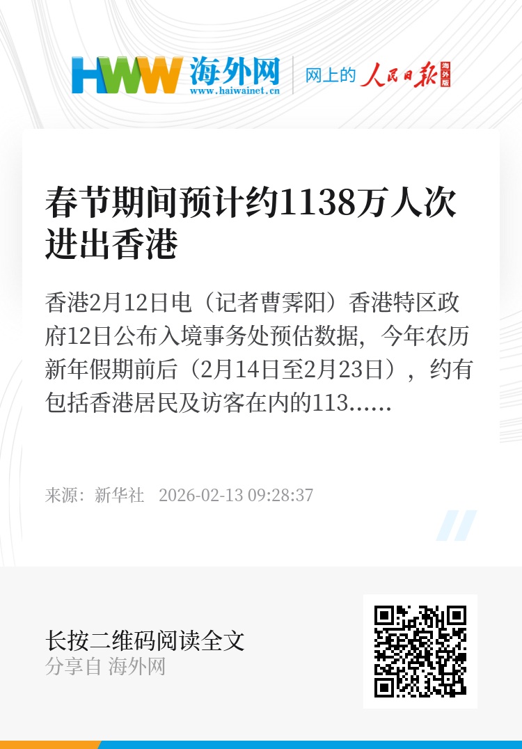 新华社香港2月12日电(记者曹霁阳)香港特区政府12日公布入境事务处预估数据,今年农历新年假期前后(2月14日至2月23日),约有包括香港居民及访客在内的1138万人次,经各海、陆、空管制站进出香港。
