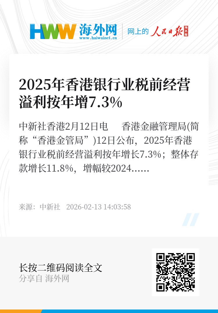 中新社香港2月12日电 香港金融管理局(简称“香港金管局”)12日公布,2025年香港银行业税前经营溢利按年增长7.3%;整体存款增长11.8%,增幅较2024年扩大4.7%。