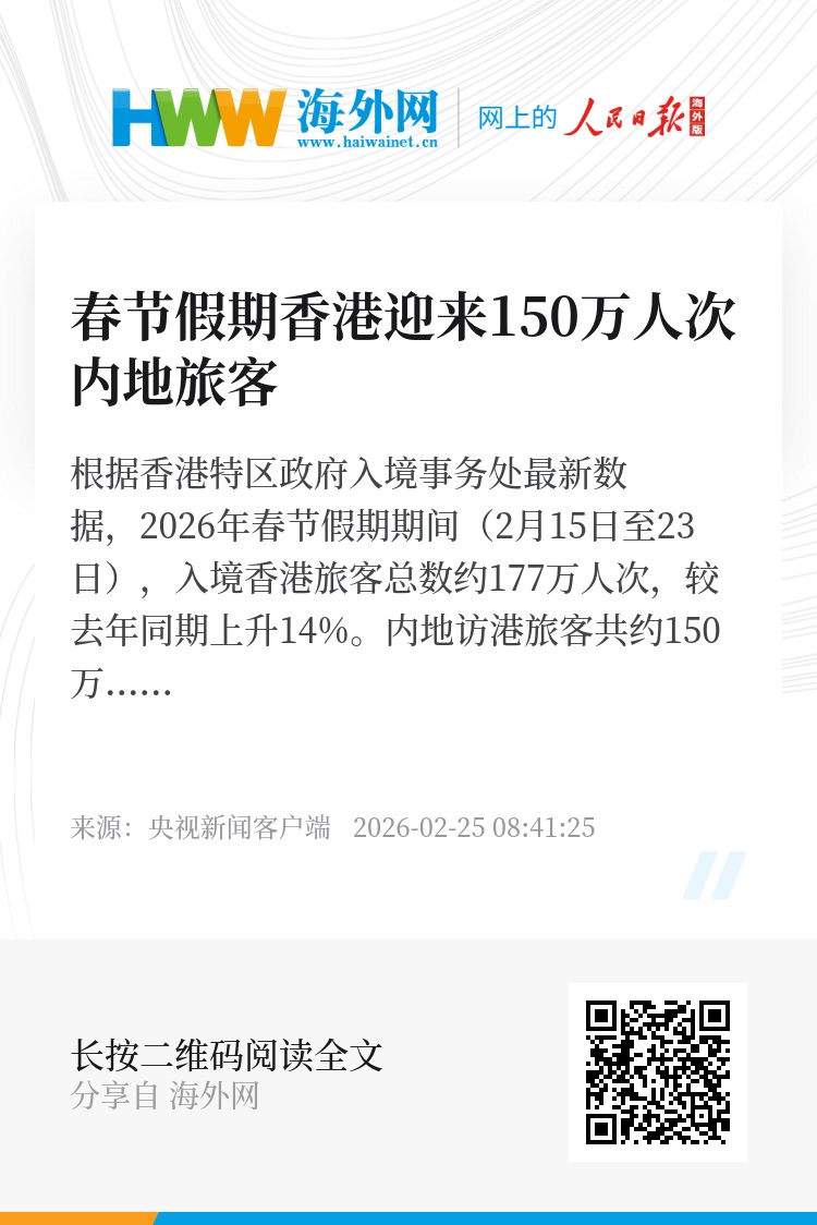 根据香港特区政府入境事务处最新数据,2026年春节假期期间(2月15日至23日),入境香港旅客总数约177万人次,较去年同期上升14%。内地访港旅客共约150万人次,较去年上升14%,而非内地访港旅客共约27万人次,同样较去年上升14%。