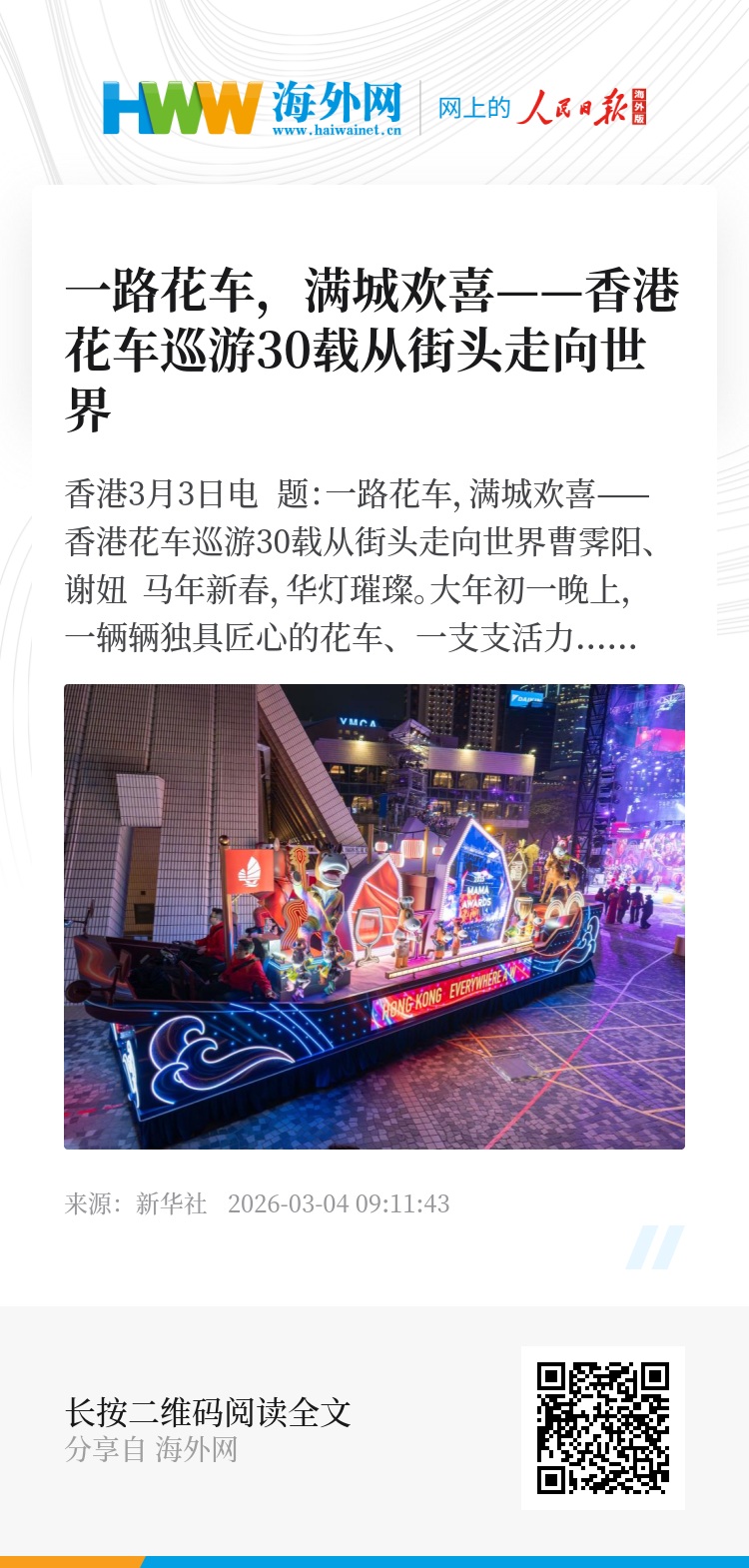 新华社香港3月3日电 题:一路花车,满城欢喜——香港花车巡游30载从街头走向世界