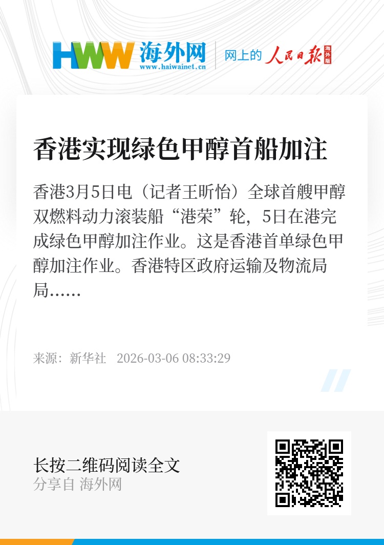 新华社香港3月5日电(记者王昕怡)全球首艘甲醇双燃料动力滚装船“港荣”轮,5日在港完成绿色甲醇加注作业。这是香港首单绿色甲醇加注作业。