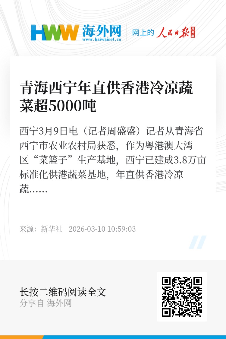 新华社西宁3月9日电(记者周盛盛)记者从青海省西宁市农业农村局获悉,作为粤港澳大湾区“菜篮子”生产基地,西宁已建成3.8万亩标准化供港蔬菜基地,年直供香港冷凉蔬菜超5000吨。