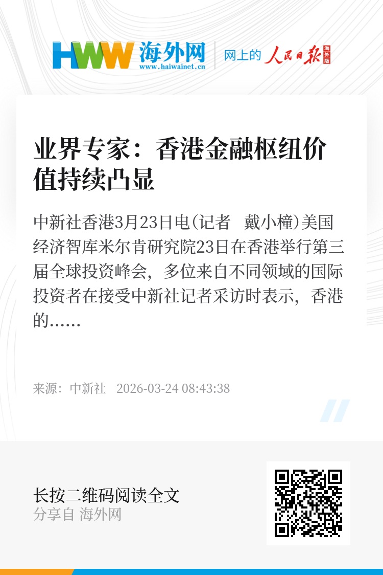 中新社香港3月23日电(记者 戴小橦)美国经济智库米尔肯研究院23日在香港举行第三届全球投资峰会,多位来自不同领域的国际投资者在接受中新社记者采访时表示,香港的国际金融中心枢纽价值持续凸显,国际资本正加速通过香港布局中国内地市场。