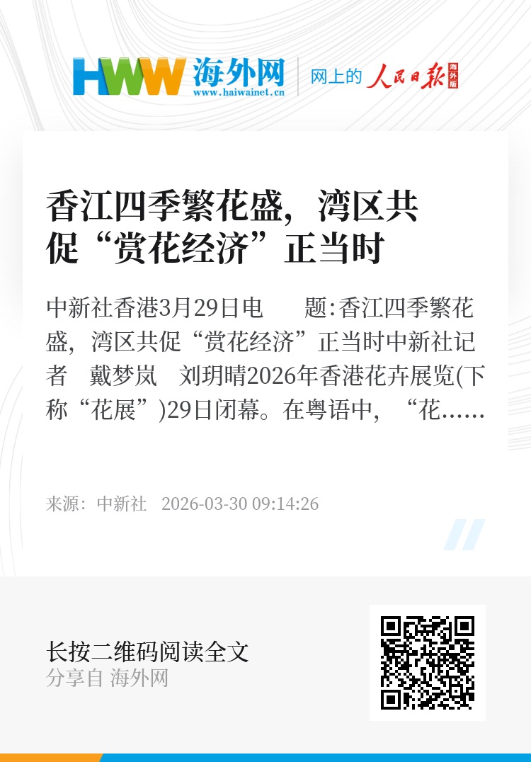 值得注意的是,在今年香港花展闭幕前夕,“2026粤港澳大湾区花展”已于3月27日在广东深圳接力启幕。崔定邦指出,香港与粤港澳大湾区其他城市地缘相近、人缘相亲,在花卉资源与城市风貌上各具特色,具备协同发展“赏花经济”的基础。