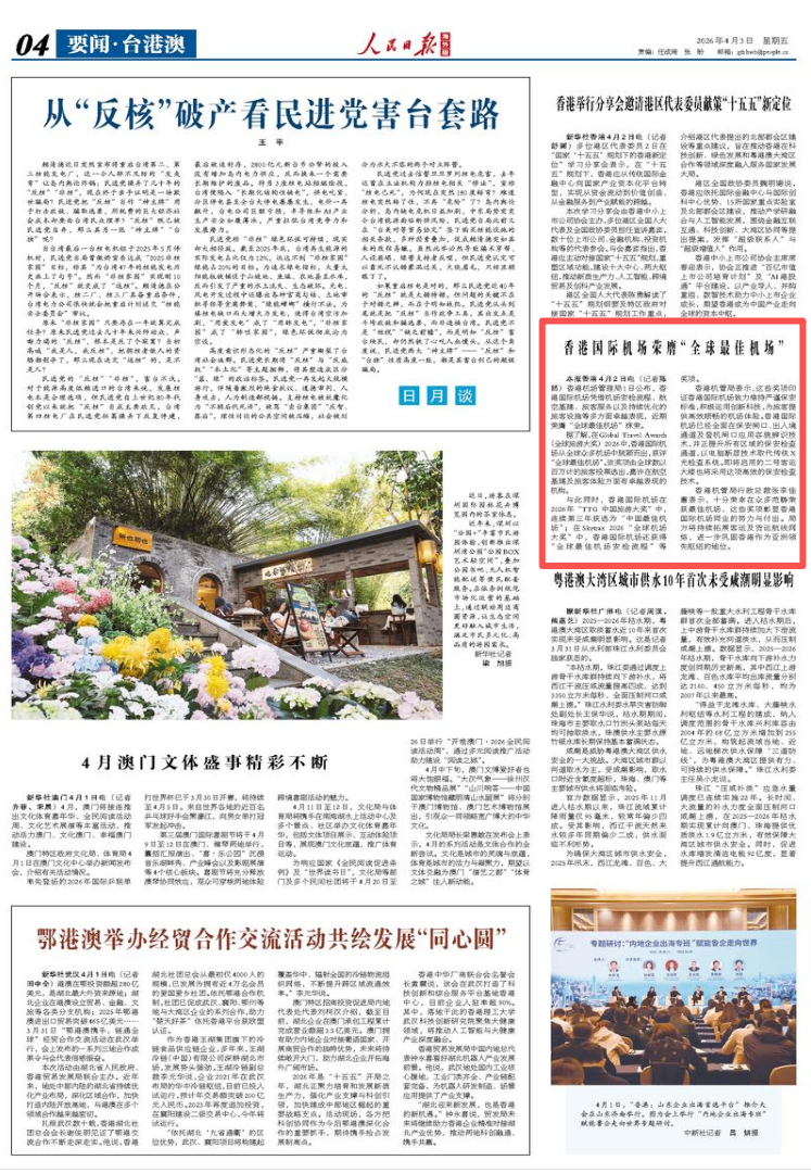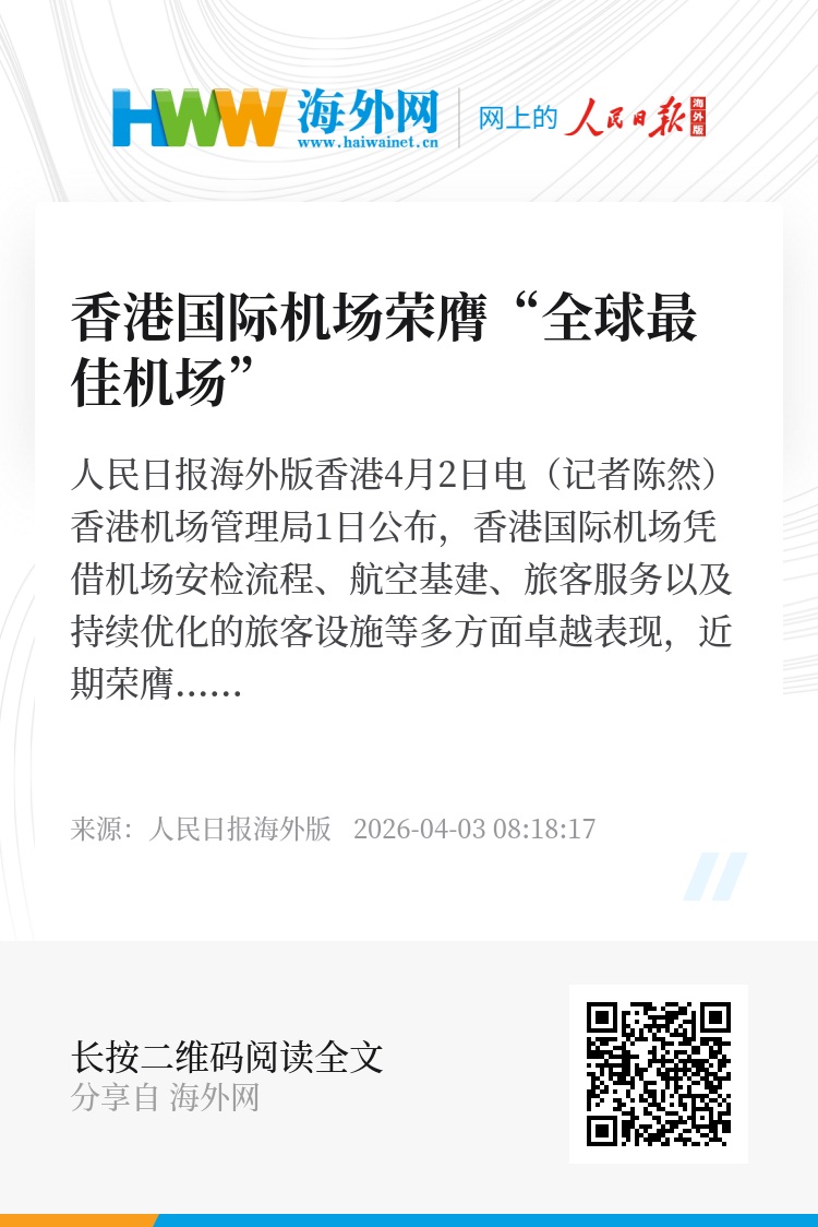 人民日报海外版香港4月2日电(记者陈然)香港机场管理局1日公布,香港国际机场凭借机场安检流程、航空基建、旅客服务以及持续优化的旅客设施等多方面卓越表现,近期荣膺“全球最佳机场”殊荣。
