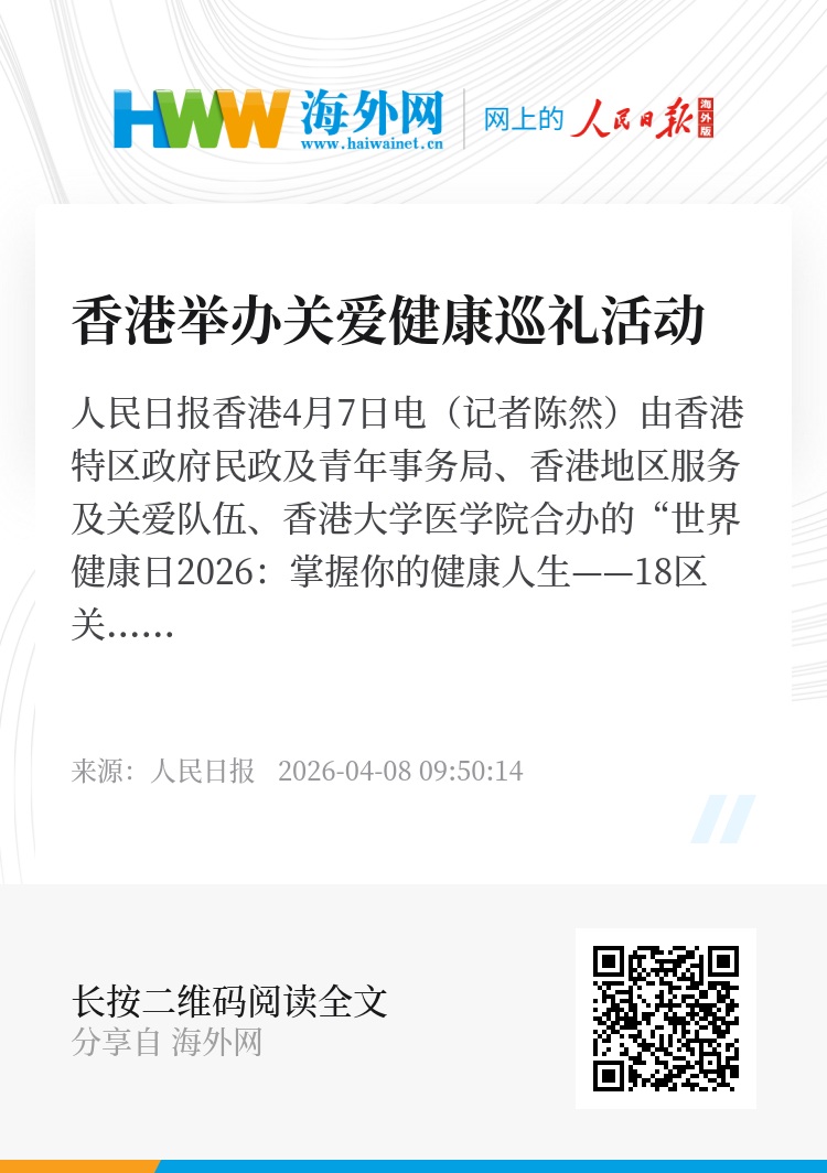 人民日报香港4月7日电(记者陈然)由香港特区政府民政及青年事务局、香港地区服务及关爱队伍、香港大学医学院合办的“世界健康日2026:掌握你的健康人生——18区关爱健康巡礼”计划,7日在香港西营盘启动,并进行首场地区外展健康推广活动,以强化社区层面的基层健康支援,让市民掌握实用健康知识。