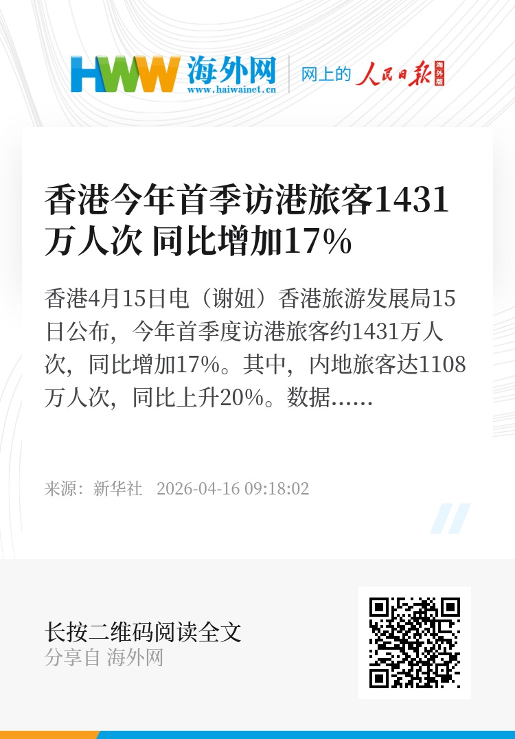 新华社香港4月15日电(谢妞)香港旅游发展局15日公布,今年首季度访港旅客约1431万人次,同比增加17%。其中,内地旅客达1108万人次,同比上升20%。