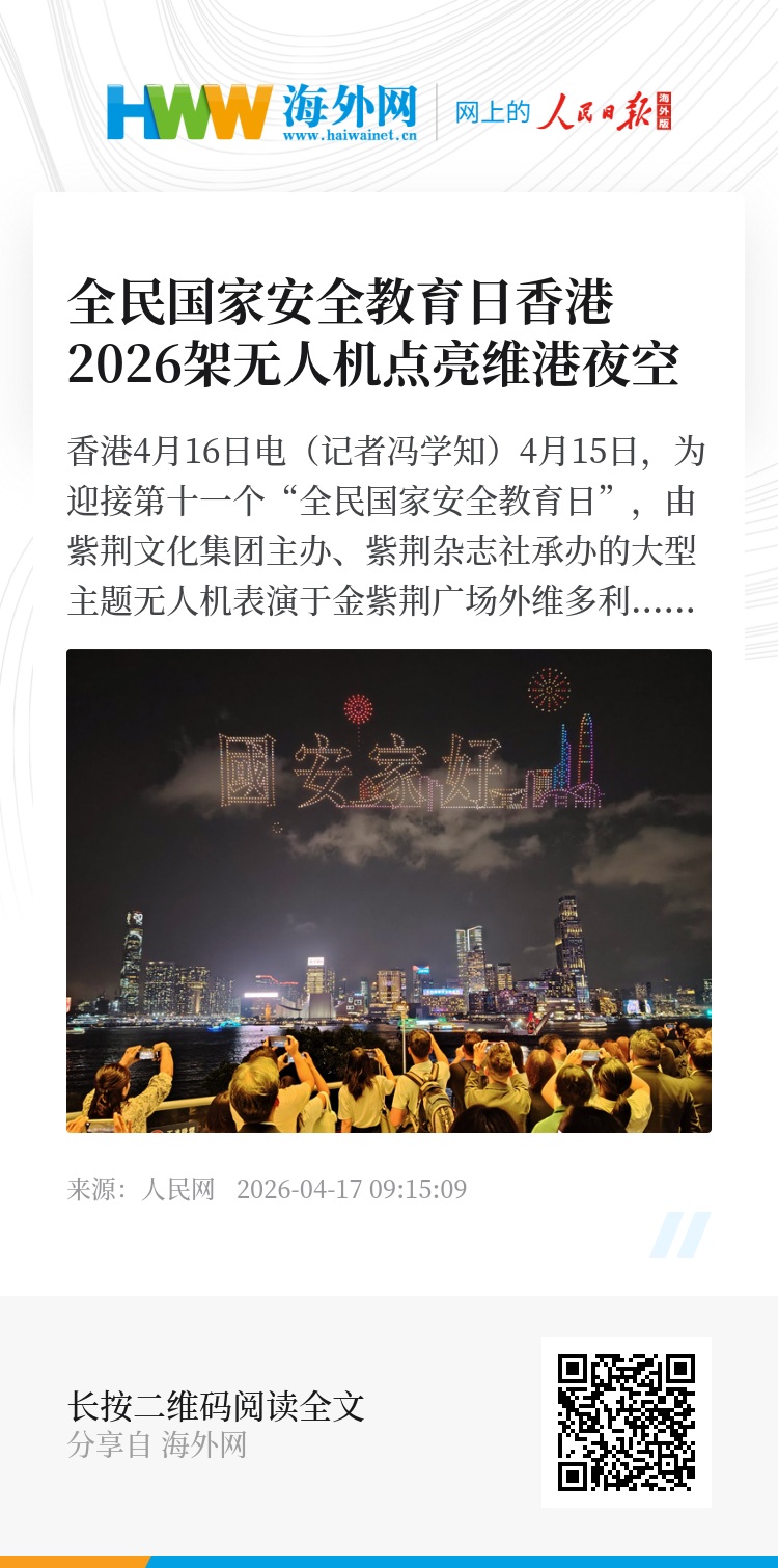 人民网香港4月16日电(记者冯学知)4月15日,为迎接第十一个“全民国家安全教育日”,由紫荆文化集团主办、紫荆杂志社承办的大型主题无人机表演于金紫荆广场外维多利亚港上空盛大举行。2026架无人机分两场次腾空而起,以天为幕、以光为笔,通过十幕融合3D立体技术与动态灯光效果的光影篇章,生动演绎国家安全的丰富内涵,营造出全民参与、共同维护国家安全的浓厚氛围。