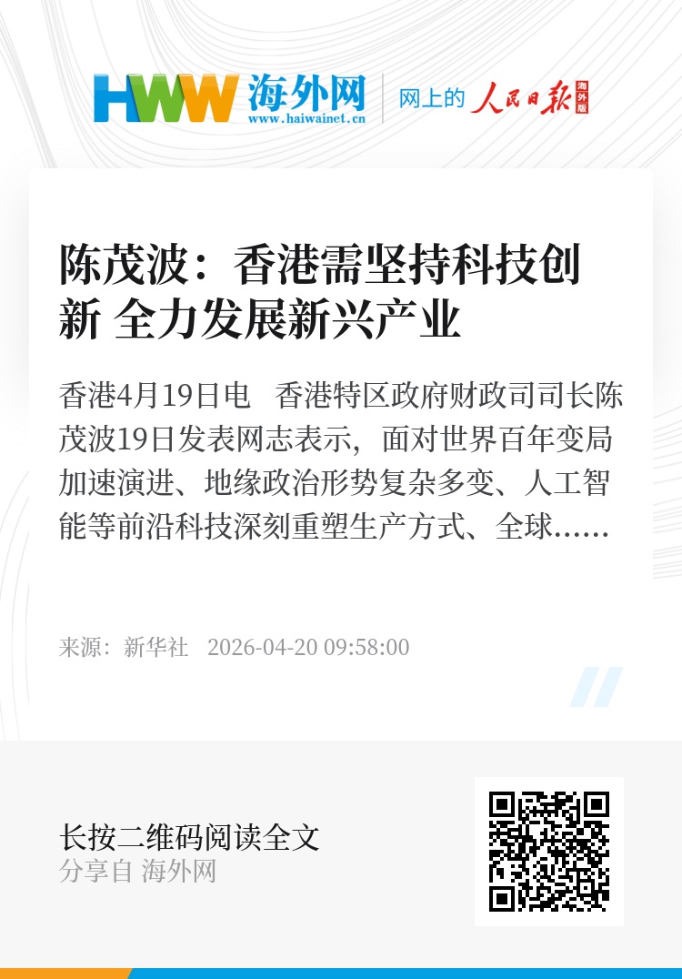 新华社香港4月19日电 香港特区政府财政司司长陈茂波19日发表网志表示,面对世界百年变局加速演进、地缘政治形势复杂多变、人工智能等前沿科技深刻重塑生产方式、全球绿色转型步伐加速推进等大趋势,香港需坚持科技创新,全力全速加快发展新兴产业及培育未来产业。