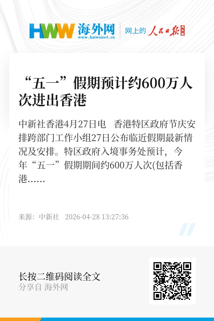 中新社香港4月27日电 香港特区政府节庆安排跨部门工作小组27日公布临近假期最新情况及安排。特区政府入境事务处预计,今年“五一”假期期间约600万人次(包括香港居民及访客)经各海、陆、空管制站进出香港。