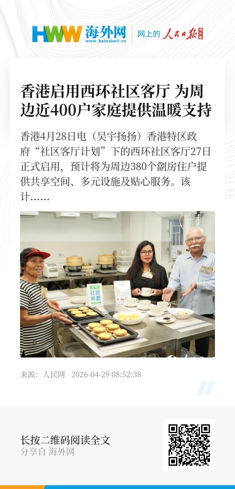 人民网香港4月28日电(吴宇扬扬)香港特区政府“社区客厅计划”下的西环社区客厅27日正式启用,预计将为周边380个劏房住户提供共享空间、多元设施及贴心服务。该计划是本届特区政府聚焦劏房住户所需,推出的精准扶贫重点项目。